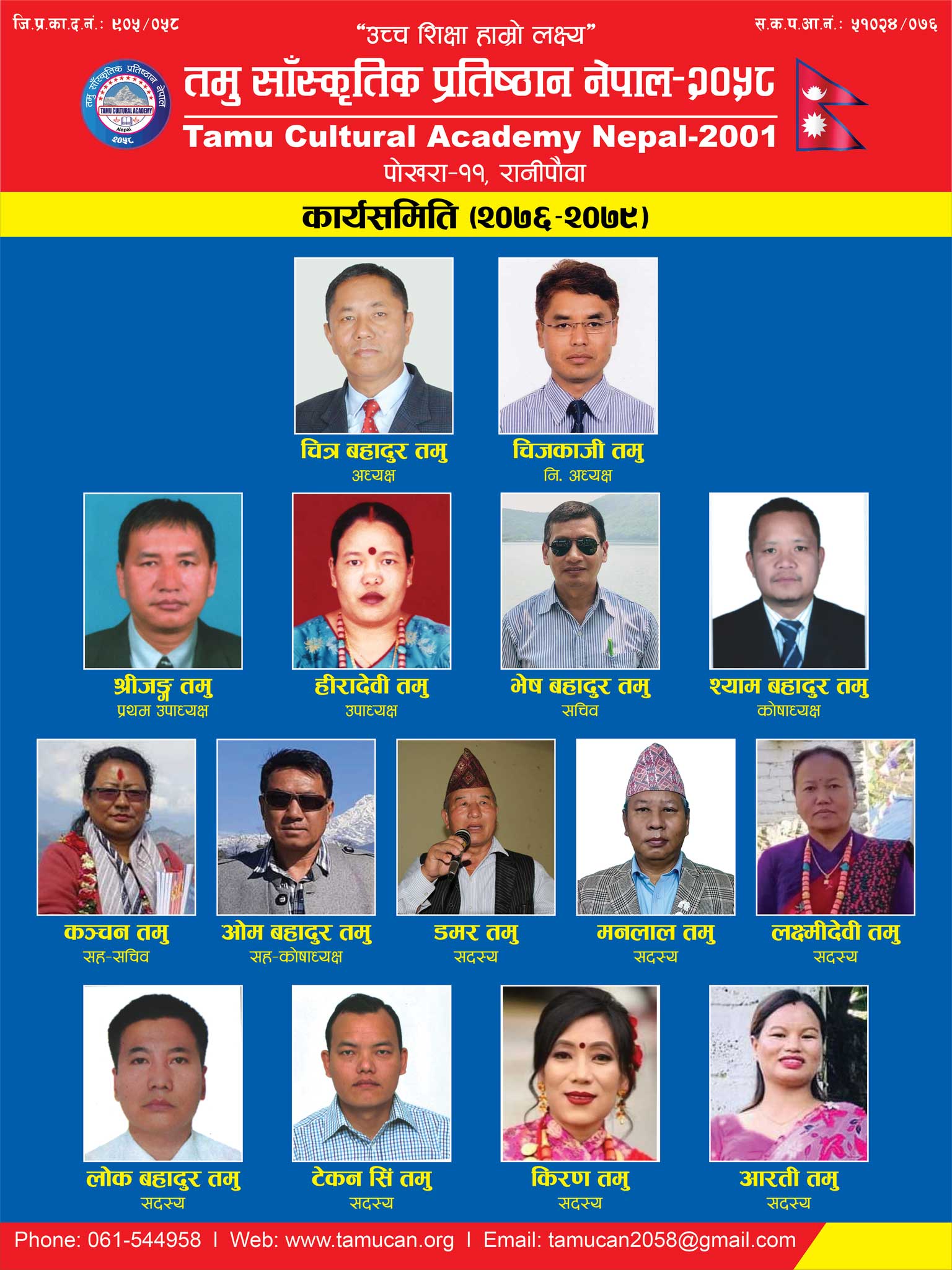 तमु सांस्कृतिक प्रतिष्ठान नेपालको अध्यक्षतामा चित्रबहादुर तमु पोखरा । उच्च शिक्षा हाम्रो लक्ष्या नाराका साथ जापानमा स्थापित तमु साँस्कृतिक प्रतिष्ठान नेपाललेको शनिबार पोखरामा सम्पन्न १७ औं वार्षिक साधारणसभा तथा आठौं अधिवेशनले चित्रबहादुर तमुको अध्यक्षतामा १५सदस्यीय कार्यसमिति गठन गरेको छ। आगामी तीन वर्षे कार्यवधिका लागि सर्वसम्मतिबाट गठित कार्यसमितिको प्रथम उपाध्यक्षमा श्रीजंग तमु, द्वितीय उपाध्यक्षमा हिरादेवी तमु, … Read more